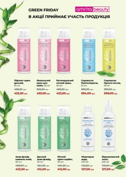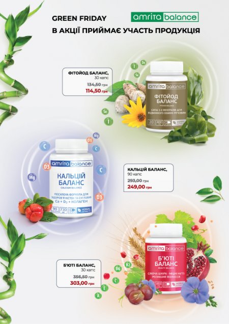 У всіх «Чорна», а у нас – «Зелена п’ятниця»! І цілий тиждень натуральних знижок, без додавання консервантів та парабенів, на вашу улюблену продукцію Amrita. У всьому світі поширюється рух Зеленная П'ятниця, як альтернатива чорної п'ятниці. З 25 по 30 листопада 2019 року придбайте товари зі знижкою -15% на вибрану продукцію лінійок : Amrita Beauty- Компанія "Амріта" - експерт в області краси та здоров'я з радістю представляє до вашої уваги свою гордість: Лікувальну косметику "Амріта" на основі "Фітомеланін" отриманого за запатентованою технологією, з березового гриба "Чага". Amrita Balance: Кальций баланс, Бьюти баланс, Фiтойот баланс. Amrita Home. Екосредства «Шанталь» ® від Компанії «Амріта» отримали схвалення і рекомендацію для цільового використання від Асоціації алергологів України.