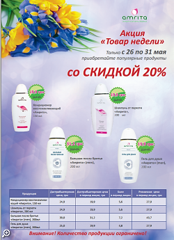 Только с 26 по 31 мая приобретайте популярные продукты со СКИДКОЙ 20%! Кондиционер восстанавливающий «Амрита», 150 мл -"Ноу-Хао"- продукции марки "Амрита"- это "фитомеланин"- основа косметической продукции- полученный с березового гриба "Чага". - "Фитомеланин" способен: оказывать фото- и радио протекторное действие. Эффективно защищает кожу от повреждающего воздействия УФ-лучей разной длины волны - А, В, С. Антиоксидант и цитопротектор. Превосходит все зарубежные аналоги по безопасности, эффективности и способности приостанавливать процессы старения. Производится в Украине. Предназначен для комплексного ухода за поврежденными, окрашенными волосами, или волосами после химической завивки. АКТИВНЫЕ ВЕЩЕСТВА: • Масло Облепихи и Фитомеланин устраняют воспаления, способствуют укреплению волосяной луковицы, стимулируют обновление кожи и рост здоровых волос. Шампунь от перхоти «Амрита», 200 мл Роскошные здоровые волосы – мечта любой женщины!