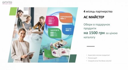 - В течении четвёртого месяца разовыми закупками набрать АКЦИЯ Мастер. И получить возможность выбрать подарок на 1 500 грн+ + Кэжбек и бонус достижения.