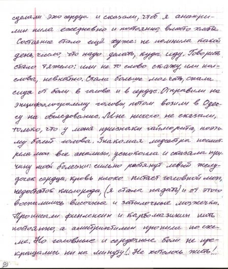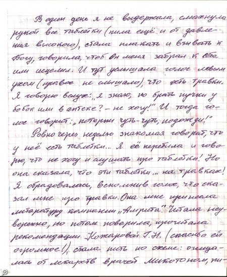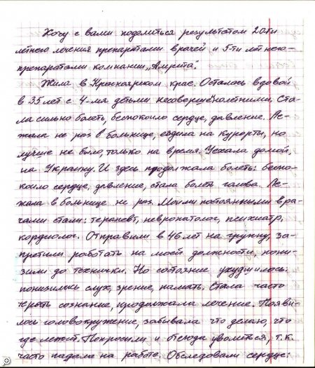 ... Как то в конце сентября заходит, ко мне в офис женщина и спрашивает: "Скажите, мне дочь сказала, что здесь у вас можно купить "Амриту"? - И голос ее при этом задрожал... -Я, говорю, присядьте, давайте я вам чай сделаю... - И тут женщина начала свой рассказ, при котором у меня набегали слезы... ...Не буду описывать происходящие.... Я, принял ее в клуб здоровья г. Измаил "Амрита"... -Она получила клубную карточку и скидку(пожизненную) на всю продукцию "Амрита" в размере 20%... -И вот зайдя неделю назад... Она спросила: " А, можно я напишу свою историю про Амриту... Пусть люди прочтут... -И, вот эти 4 листа ученической тетради передо мной... Я, решил их не перепечатывать пусть в оригинале люди прочтут... -И так эти 4 письма: Для просмотра кликните по письму: Детальнее на сайте.