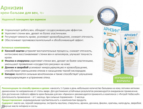 На основании проведенных клинических испытаний на базе Института урологии и нефрологии Академии медицинских наук Украины крем для вен «Арнизин» рекомендуется к использованию как лечебно-профилактическое средство, которое предупреждает возникновение отеков и способствует нормализации работы вен, регулирует вязкость крови и усиливает кровообращение.