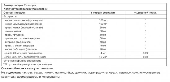 Женская формула + Zn + Se. Способствует уменьшению маточного кровотечения