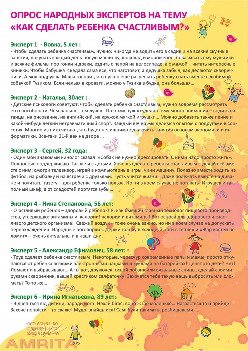 О серьёзном с юмором! Эксперт 1 - Вовка, 5 лет : - Чтобы сделать ребенка счастливым, нужно: никогда не водить его в садик и на всякие скучные занятия, покупать каждый день новую машинку, шоколад и мороженое, показывать ему мультики и всякие фильмы про гонки и драки, ездить с папой на велосипеде, а с мамой – читать интересные книжки. Чтобы бабушка съедала сама все, что наготовит, а дедушка забыл, как делаются скворечники. А моя подружка Маша говорит, что нужно еще разрешать ребенку спать вместе с любимой собачкой Тузиком. Если нельзя в кровати, можно у Тузика в будке, она большая… Эксперт 2 - Наталья, 30лет : - Детские психологи советуют: чтобы сделать ребенка счастливым, нужно вовремя рассмотреть его способности. Чем раньше, тем лучше. Поэтому нужно уделять ему много внимания – водить на танцы, на рисование, на английский, на кружок мягкой игрушки… Можно добавить также пение и какой-нибудь легкий нетравматичный спорт. Каждый вечер мы делимся опытом с подругами в соцсетях. Многие из них считают, что будет нелишним подключить занятия основам экономики и информатики. Все-таки 21-й век на дворе …