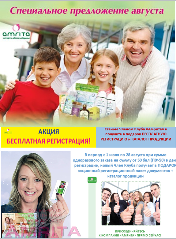 По 30 августа 2014 года в СП новые клиенты, желающие стать Членами Клуба «Амрита», при условии совершения покупки на 50 баллов и более (ПО≥50), смогут ЗАРЕГИСТРИРОВАТЬСЯ БЕСПЛАТНО и получить в ПОДАРОК КАТАЛОГ ПРОДУКЦИИ*!