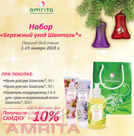 Исландский мох, 50 табл. Арнизин крем-гель с согревающим эффектом, 50 г Детальнее о наборе: ---->>>> Предлагаем Вам c 1 по 15 января Подарочный набор «Бережный уход Шанталь» Для просмотра в полный размер- кликните по фото. При покупке: Крем для рук Шанталь очень легкий, он действительно делает руки мягкими и ухоженными, снимает чувство стянутости и сухости кожи, не требуя при этом частых повторных нанесений. Для ежедневного ухода за ногами и профилактики таких неприятностей, как натоптыши, трещинки и сухие мозоли на ступнях и пальцах ног, необходимо использовать специальный косметический крем. Шампунь-кондиционер 2 в 1 для сухих и нормальных волос, 350 г ПОДАРОК к набору - красивый ПРАЗДНИЧНЫЙ ПАКЕТ. Цена набора: 71,4 грн. Детальнее о наборе: ---->>>> Предлагаем Вам c 1 по 15 января«Сияние молодости» : Для просмотра в полный размер- кликните по фото. В набор входят НОВИНКИ косметической линии аmrita® - лимитированный комплекс на основе уникального сочетания эфирного масла розы и Fitomelanin®. Сыворотка для лица и шеи аmrita®, 90 г Счастья Вам, Здоровья и Благополучия в Новом Году! Мирного Неба Над Головой!