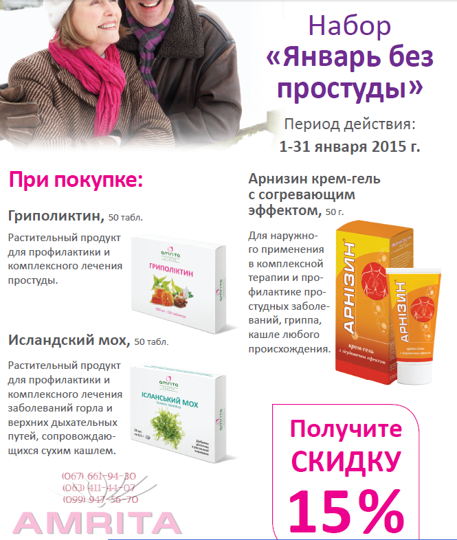Уважаемые наши клиенты. Поздравляем вас с Новым годом! Желаем вам в Новом году творческого и финансового роста, здоровья, радости и благополучия! И спасибо за то, что сотрудничаете с нами! Предлагаем Вашему вниманию праздничные наборы января от Компании «Амрита»: Впереди Старый Новый Год, а органимзм от обилия сьеденного и выпитого дает о себе знать, ранее не известными симптомами. Мы предлагаем Вам c 1 по 31 января Акционный набор: «Здоровый желудок». Для просмотра в полный размер- кликните по фото. При покупке: Из-за мягкого слабительного действия шрот рекомендуют принимать для устранения таких проблем, как метеоризм и запоры, а также для профилактики заболеваний печени и желчевыводящих путей. Цена набора: 139,30 Детальнее о наборе: ---->>>> Так же предлагаем Вам c 1 по 31 января- Акционный набор : «Январь без простуды»