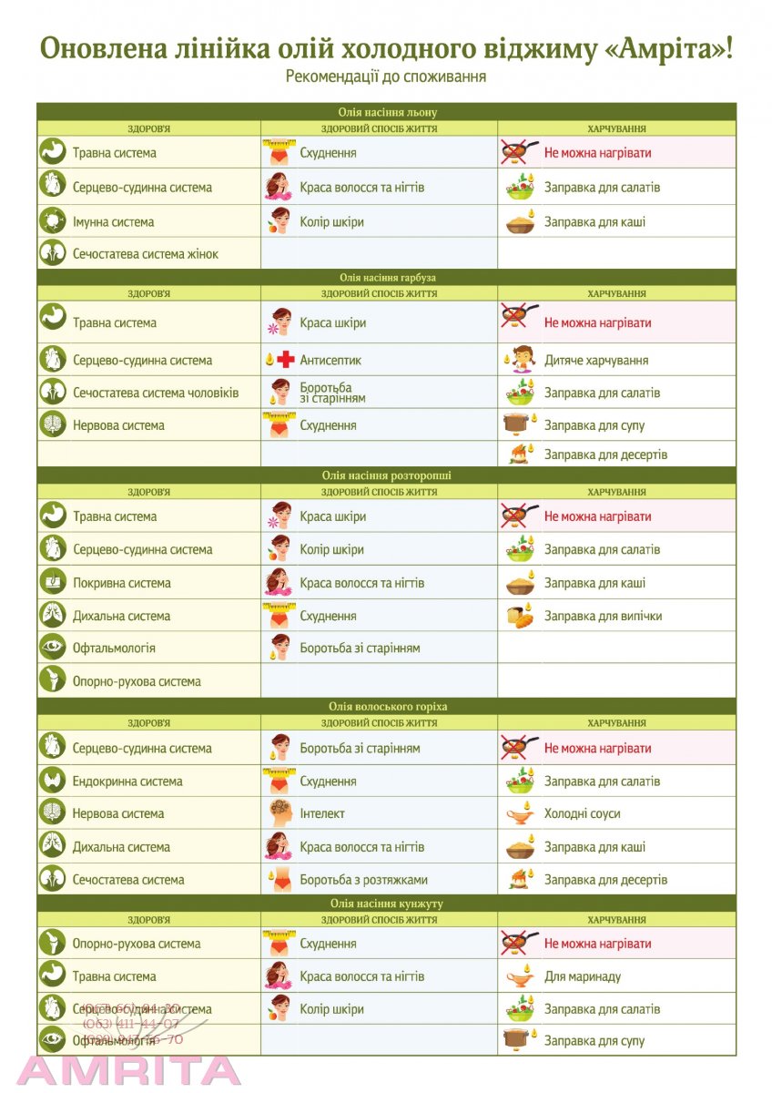 Масла, полученные по технологии холодного отжима, сохраняют все питательные и вкусовые вещества. Технология холодного отжима - наиболее дорогой способ получения масла, поскольку выход конечного продукта из сырья не превышает 30%. Не все компании могут себе это позволить. Чаще всего производители используют другие способы получения растительных масел (горячий отжим,экстракция). Это помогает увеличить выход готового продукта, но не позволяет в полной мере сохранить его полезные свойства. Все масла «Амрита» производятся из термически необработанных, сырых семян, чтобы сохранить все витамины. Мы всегда ставим качество продукта на первое место, именно поэтому наши масла проходят постоянный контроль качества, в том числе, в аккредитованных лабораториях Украины. Для ПРОСМОТРА ТАБЛИЦЫ в полном размере- кликните по фото!