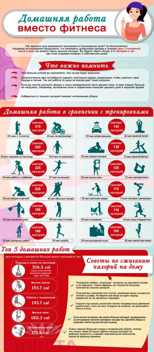 Домашняя уборка - это более дешевый и более продуктивный способ сжечь массу калорий, поэтому узнайте из таблицы ,что вы можете делать в своем доме, по сравнению с тренировкой в тренажерном зале. Просмотрите таблицу и выберите ежедневный набор работы, по количеству калорий которые Вам надо сжечь. И квартиру приведете в порядок и массу калорий сожжете. Так же рекомендуем пройти усиленную 2-х месячную очистку от паразитов: Осторожно суши. Гельминтоз. Шокирующие видео.