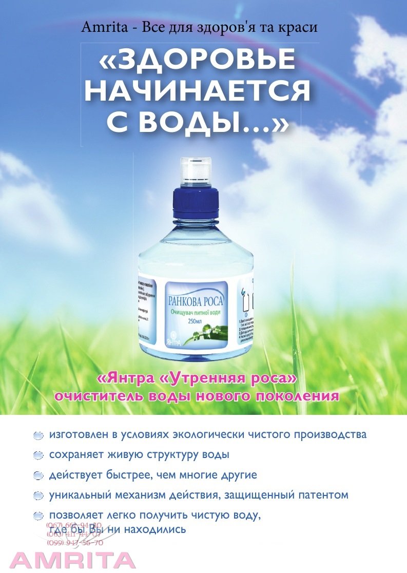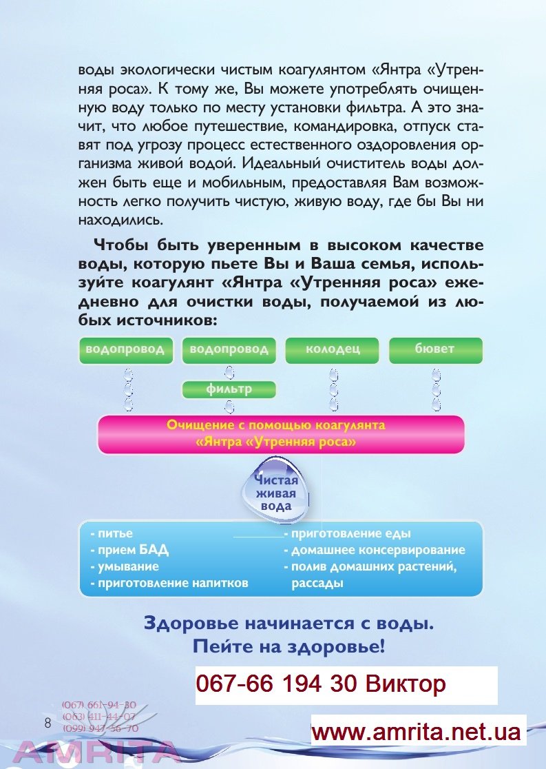 Чтобы быть уверенным в высоком качестве воды, которую пьете Вы и Ваша семья, используйте коагулянт «Янтра «Утренняя роса» ежедневно для очистки воды, получаемой из любых источников: Здоровье начинается с воды. Пейте на здоровье! Мнение специалиста: Галина Гуренко , химик-биолог , 15 лет заведовала санитарно-профилактической экологической лабораторией по Красноармейск уголь На сегодняшний день ситуация с питьевой водой во всем мире очень сложная. Не исключение Украина , Россия и другие страны постсоветского пространства. Из кранов течет вода , не пригодная для питья. Даже если учесть , что на наших водоочистных станциях ее и очистят до состояния питьевой , то в дом она придет уже совершенно иного качества. Водоводы требуют замены. Да плюс еще хлор , который как уже доказано , является по своей сути «бомбой»замедленного действия. Многие люди не имеют даже такой воды и пользуются водой из колодцев , особенно в сельской местности. Однако вода из колодцев зачастую еще худшего качества, чем водопроводная, ввиду массового сброса отходов промышленными предприятиями. Как же быть, ведь хочется надолго оставаться здоровым. А наша здоровье, как уже доказано, на 80% зависит от качества питьевой воды. Где же взять ту самую , которая дана нам изначально природой. Кто то нашел этот выход , купив фильтр. Но к сожалению они рассчитаны на доочистку уже питьевой воды (смотри инструкцию). А как мы знаем, 80% подаваемой воды относится к разряду технической. Да и на колодец фильтр не оденешь. В такой ситуации лучше всего использовать коагулянты. Этот метод очистки повторяет природный. (Связывает вредные вещества и оставляет полезные) Эффективно работает как в горячей так и холодной воде. Используется для очистки любой воды (водопровод, родники и т.д.) Не накапливает, как фильтры, вредные вещества. Исключает использование подделок На сегодняшний день самым эффективным и перспективным является коагулянт торговой марки электус- с 2010 года-эксклюзив но выпускаемый для фирмы "Амрита"-под маркой "Янтра "Утренняя роса". Детальнее на сайте.