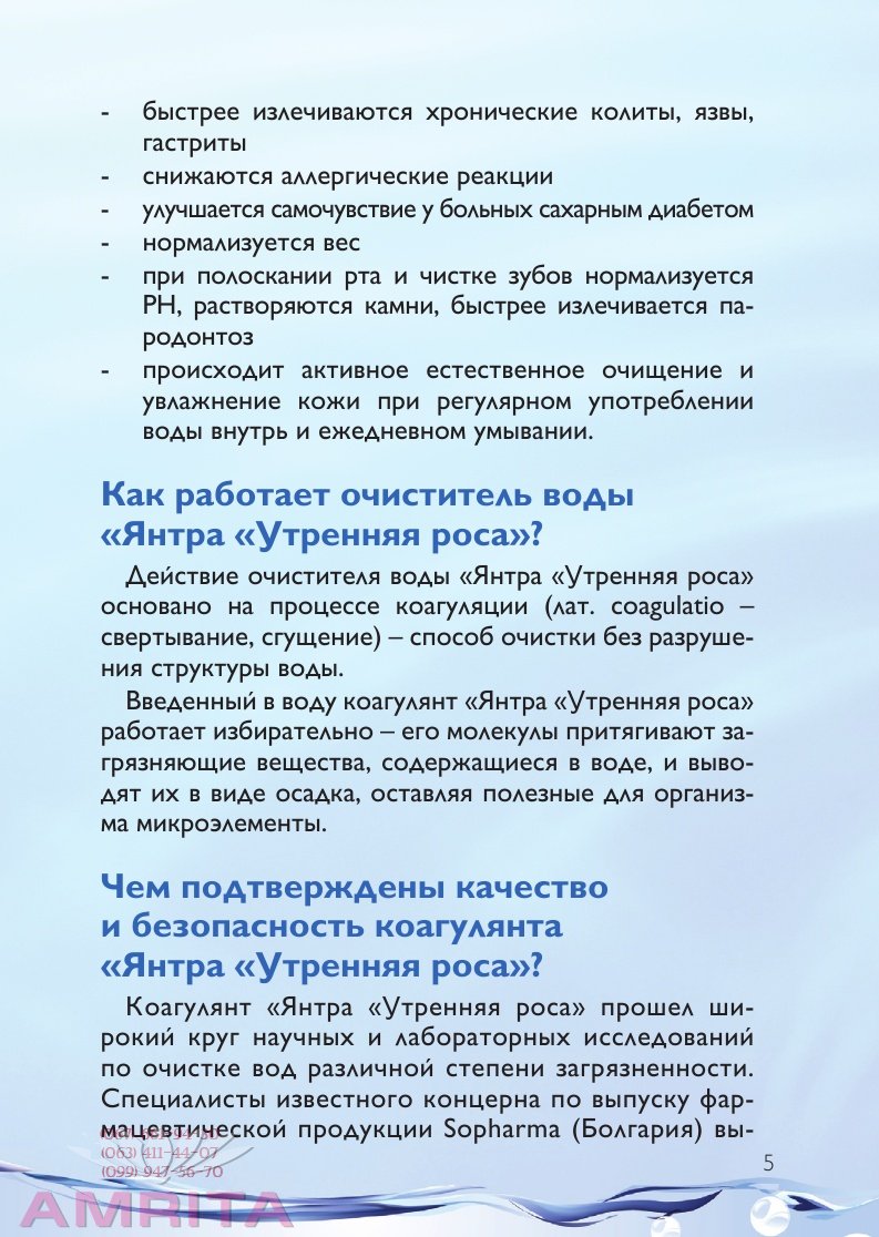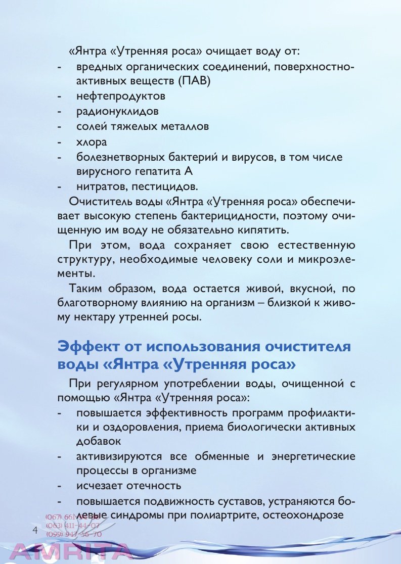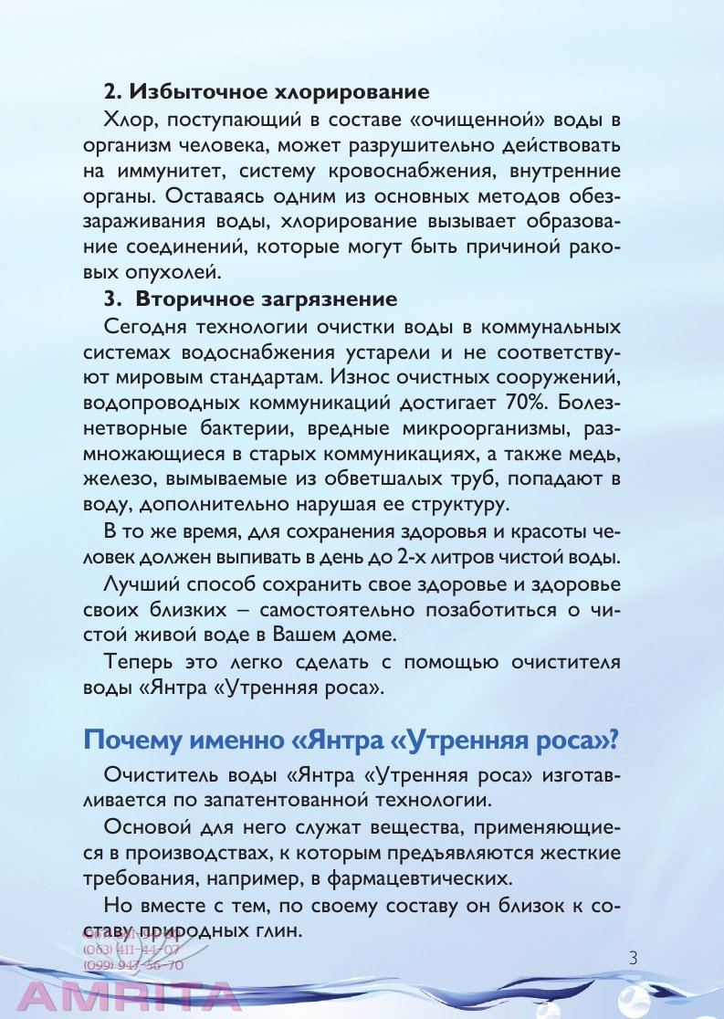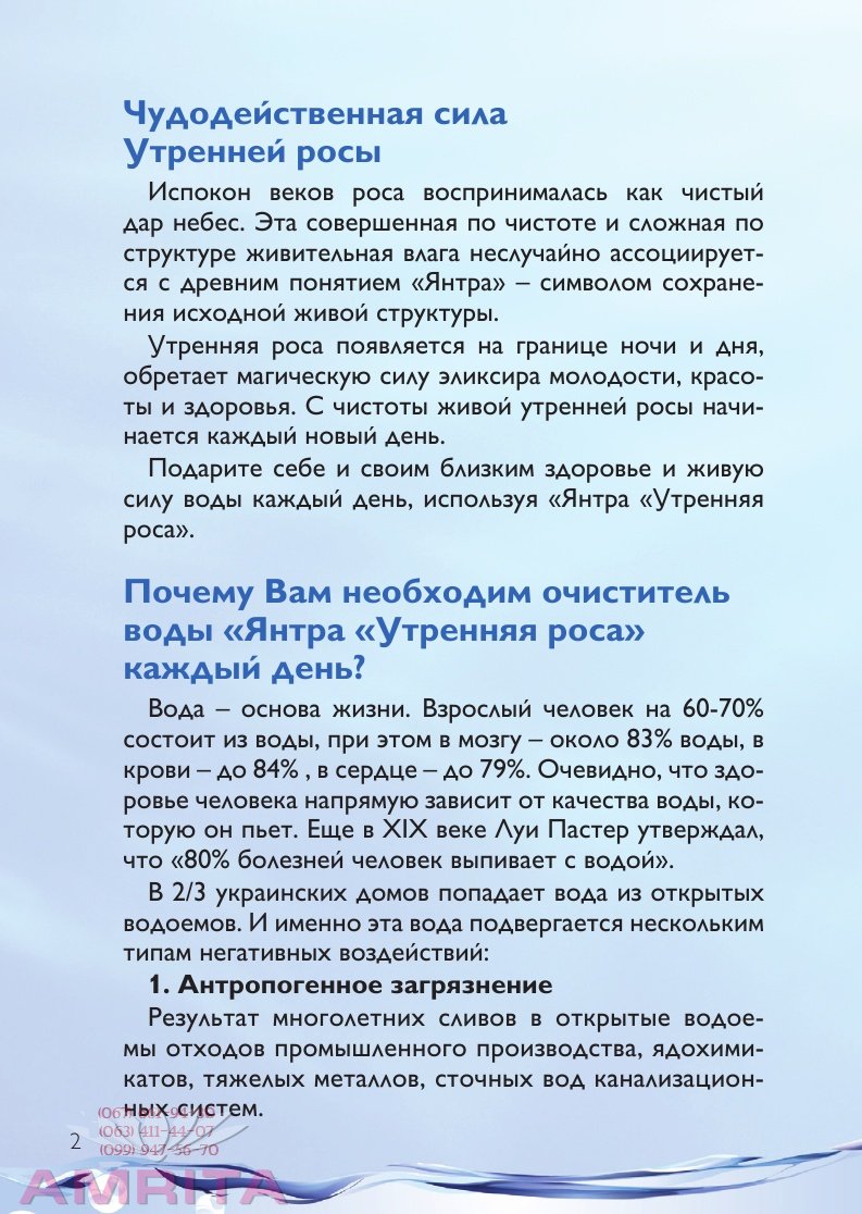 Вода – основа жизни. Взрослый человек на 60-70% состоит из воды, при этом в мозгу – около 83% воды, в Результат многолетних сливов в открытые водоемы отходов промышленного производства, ядохимикатов, тяжелых металлов, сточных вод канализационных систем. 2. Избыточное хлорирование Хлор, поступающий в составе «очищенной» воды в организм человека, может разрушительно действовать на иммунитет, систему кровоснабжения, внутренние органы. Оставаясь одним из основных методов обеззараживания воды, хлорирование вызывает образование соединений, которые могут быть причиной раковых опухолей. 3. Вторичное загрязнение Сегодня технологии очистки воды в коммунальных системах водоснабжения устарели и не соответствуют мировым стандартам. Износ очистных сооружений, водопроводных коммуникаций достигает 70%. Болезнетворные бактерии, вредные микроорганизмы, размножающиеся в старых коммуникациях, а также медь, железо, вымываемые из обветшалых труб, попадают в воду, дополнительно нарушая ее структуру. В то же время, для сохранения здоровья и красоты человек должен выпивать в день до 2-х литров чистой воды. Лучший способ сохранить свое здоровье и здоровье своих близких – самостоятельно позаботиться о чистой живой воде в Вашем доме. Теперь это легко сделать с помощью очистителя воды «Янтра «Утренняя роса». Почему именно «Янтра «Утренняя роса»? Очиститель воды «Янтра «Утренняя роса» изготавливается по запатентованной технологии. Основой для него служат вещества, применяющиеся в производствах, к которым предъявляются жесткие требования, например, в фармацевтических. Но вместе с тем, по своему составу он близок к составу природных глин. «Янтра «Утренняя роса» очищает воду от: - вредных органических соединений, поверхностно- активных веществ (ПАВ) - нефтепродуктов - радионуклидов - солей тяжелых металлов - хлора - болезнетворных бактерий и вирусов, в том числе вирусного гепатита А - нитратов, пестицидов. Очиститель воды «Янтра «Утренняя роса» обеспечивает высокую степень бактерицидности, поэтому очи- щенную им воду не обязательно кипятить. При этом, вода сохраняет свою естественную структуру, необходимые человеку соли и микроэлементы. Таким образом, вода остается живой, вкусной, благотворному влиянию на организм – близкой к живому нектару утренней росы. Эффект от использования очистителя воды «Янтра «Утренняя роса» При регулярном употреблении воды, очищенной с помощью «Янтра «Утренняя роса»: - повышается эффективность программ профилактики и оздоровления, приема биологически активных добавок - активизируются все обменные и энергетические процессы в организме - исчезает отечность - повышается подвижность суставов, устраняются болевые синдромы при полиартрите, остеохондрозе -быстрее излечиваются хронические колиты, язвы,гастриты - снижаются аллергические реакции - улучшается самочувствие у больных сахарным диабетом - нормализуется вес - при полоскании рта и чистке зубов нормализуется РН, растворяются камни, быстрее излечивается пародонтоз - происходит активное естественное очищение и увлажнение кожи при регулярном употреблении воды внутрь и ежедневном умывании. Как работает очиститель воды «Янтра «Утренняя роса»? Действие очистителя воды «Янтра «Утренняя роса» основано на процессе коагуляции (лат. coagulatio – свертывание, сгущение) – спо