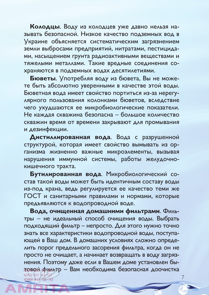 Способ применения коагулянта 1. Ввести очиститель воды «Янтра «Утренняя роса» в емкость из расчета 1 мл на 1 л воды (вместимость прозрачного колпачка флакона 5мл). 2. Наполнить емкость водой. 3. Дать отстояться в течение 4 часов. 4. Чистый средний слой воды слить через трубку, или выделить с помощью фильтра. Почему коагулянт «Янтра «Утренняя роса» – самый качественный и безопасный способ очищения воды? Сегодня существует возможность получения воды из альтернативных источников, используя при этом приборы для очистки воды. Однако все эти способы имеют весомые недостатки, а некоторые – несут дополнительную угрозу организму. -Колодцы. Воду из колодцев уже давно нельзя называть безопасной. Низкое качество подземных вод в Украине объясняется систематическим загрязнением земли выбросами предприятий, нитратами, пестицидами, насыщением грунта радиоактивными веществами и тяжелыми металлами. Такие вредные соединения сохраняются в подземных водах десятилетиями. Бюветы. Употребляя воду из бювета, Вы не можете быть абсолютно уверенными в качестве этой воды.