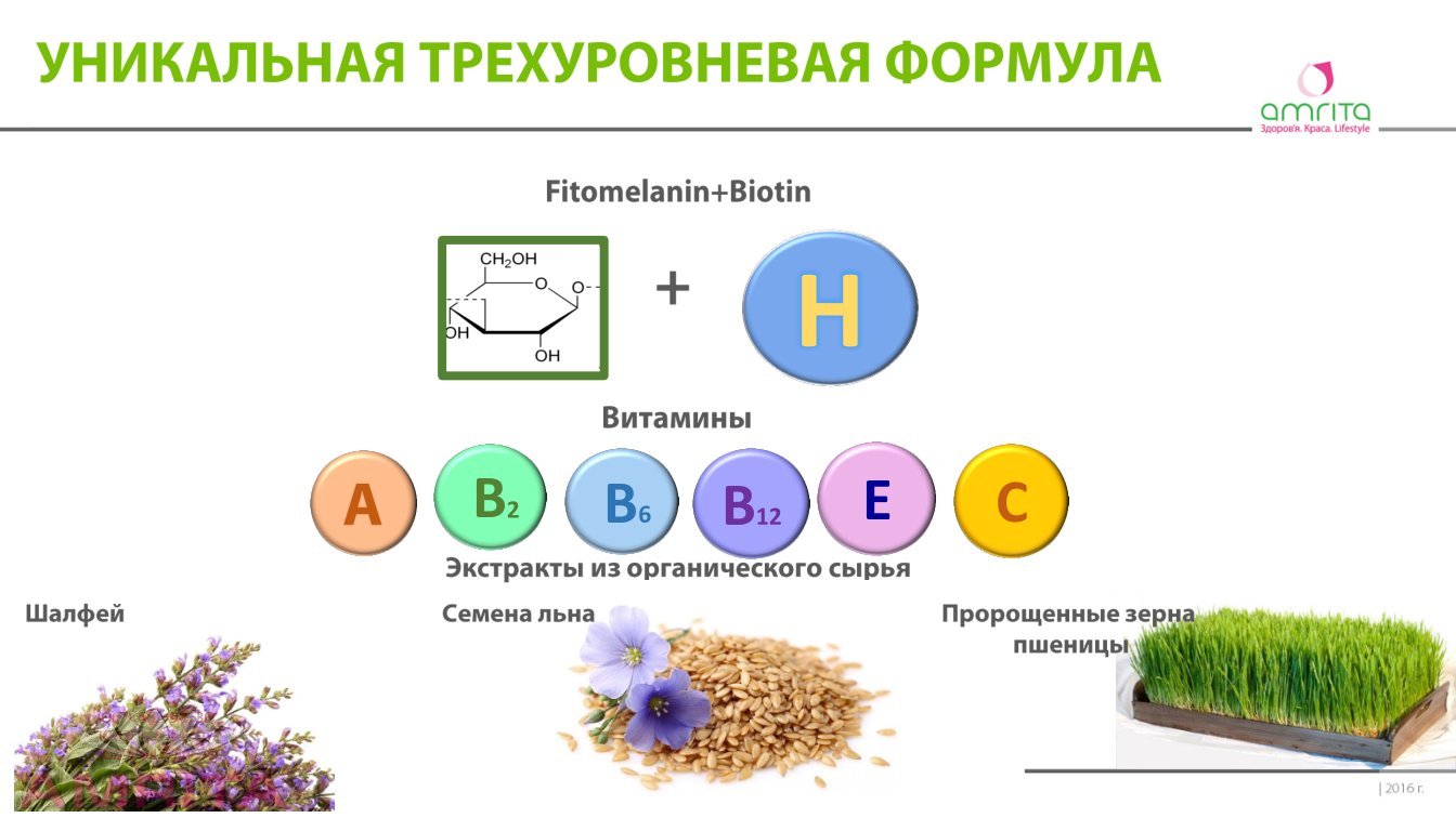 Экспертная формула внутренней косметики «Amrita Perfect Beauty. Идеальная красота» состоит из трех уровней:- Fitomelanin® + Biotin;