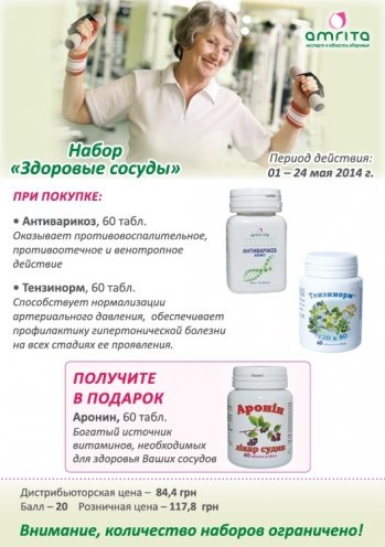 С приходом долгожданной весны наступает волна заболеваний сердца и сосудов. А ведь именно в весенний период наш организм особенно ослаблен и наиболее уязвим, что бы помочь комфортно войти в Лето и укрепить сосуды Эксперт в области здоровья на Украине компания " Амрита" предлагает Вам пропить комплекс : " Набор здоровые сосуды"