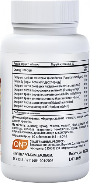 Важной особенностью лекарственных растений является то, что они быстрее и активнее включаются в биохимические процессы человеческого организма, чем химические синтетические средства. Широкий выбор терапевтически активных ингредиентов в лекарственных растениях, возможность их комбинированного применения, эффективность и высокий профиль безопасности способствуют широкому использованию средств на основе растительного сырья.СОСТАВ 1 табл.: экстракт плодов фенхеля обыкновенного 60 мг, бетаина гидрохлорид 50 мг, экстракты: цветов ромашки лекарственной 40 мг, листа подорожника большого 40 мг, травы тысячелистника обыкновенного 40 мг, травы золототысячника 30 мг, листьев мяты перечной 30 мг, корней цикория 30 мг.Фенхель известное пищевое и лекарственное растение.- В современной народной медицине плоды фенхеля заваривают как чай и пьют при кишечных коликах, при нарушениях пищеварения, как ветрогонное, отхаркивающее, как лактогенное,