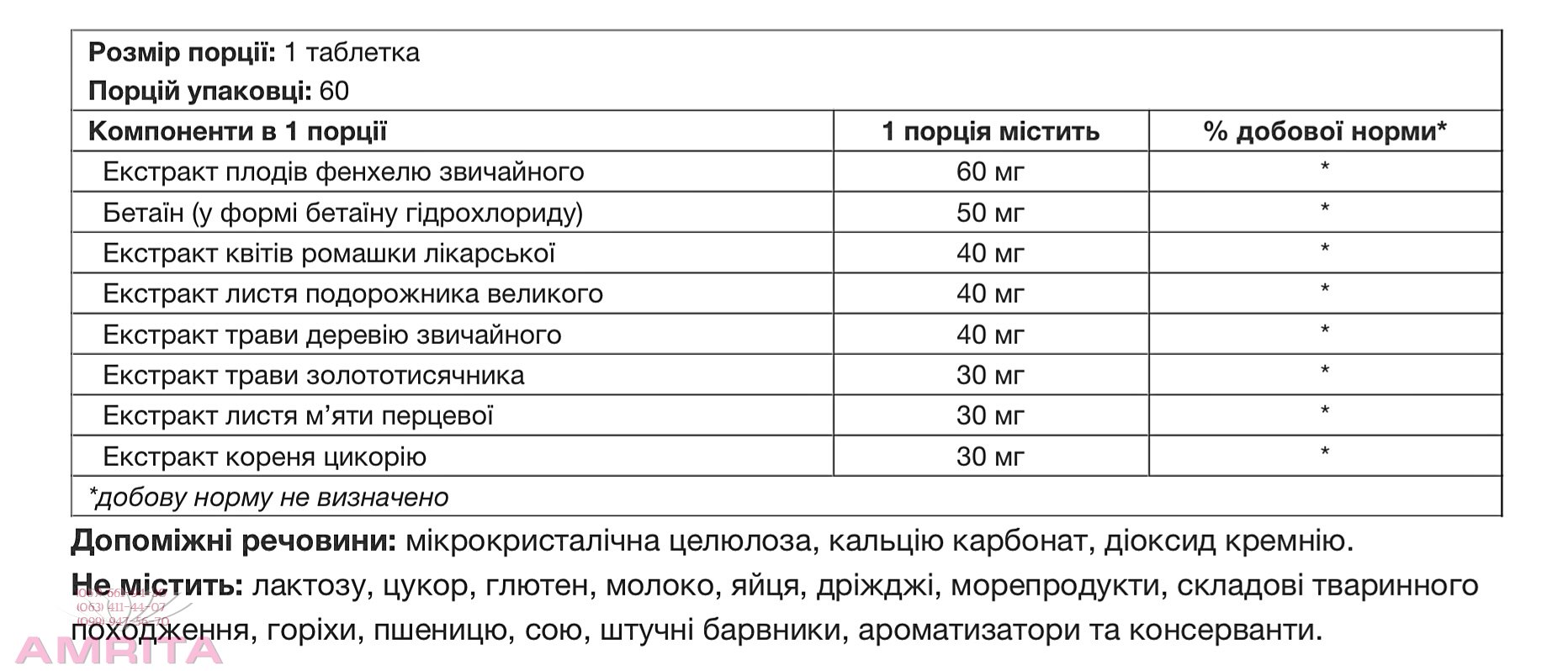 Витаминно-минеральный профилактический комплекс, нормализующий деятельность желудочно-кишечного тракта и печени. Биоактивные вещества растений, входящие в состав комплекса способствуют нормализации фагоцитоза, Комплексная формула растительных экстрактов лекарственных трав и бетаина для улучшения пищеварительных процессов и нормализации работы желудочно-кишечной системы при нормальной и сниженной секреции желудочного сока.