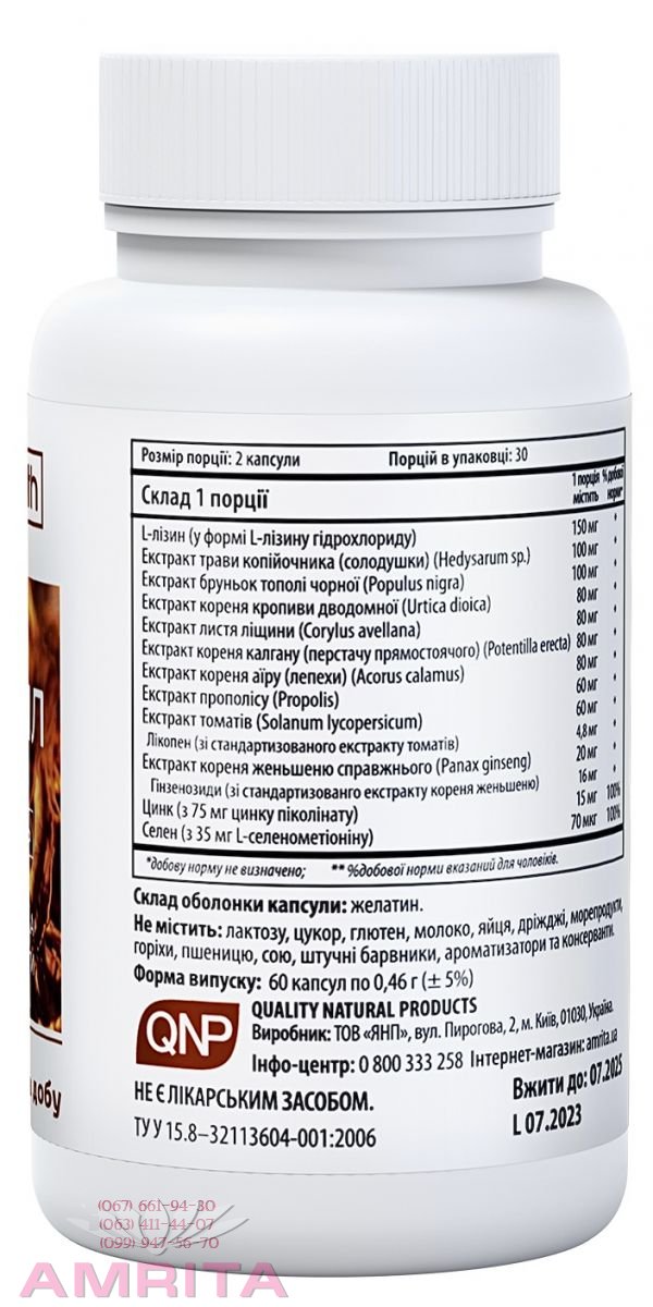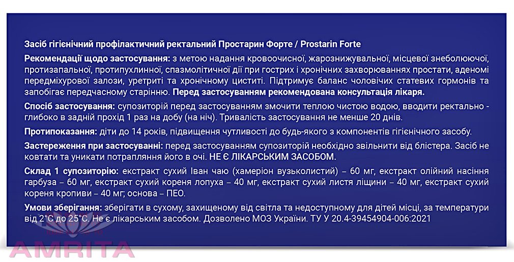 «Простасил Калган + женьшень» від Amrita – дієва багатокомпонентна формула, що містить 12 активних компонентів для профілактики захворювань простати та нормалізації функціонування сечостатевої системи у чоловіків. Виявляє болезаспокійливу, спазмолітичну, легку діуретичну, протизапальну, бактерицидну, протимікробну і протипухлинну дію. Сприяє зменшенню запалення в сечовому міхурі та простаті, усуненню дизуричних проявів, укріпленню стінок судин, поліпшенню мікроциркуляції, відновленню енергії та статевої функції.
