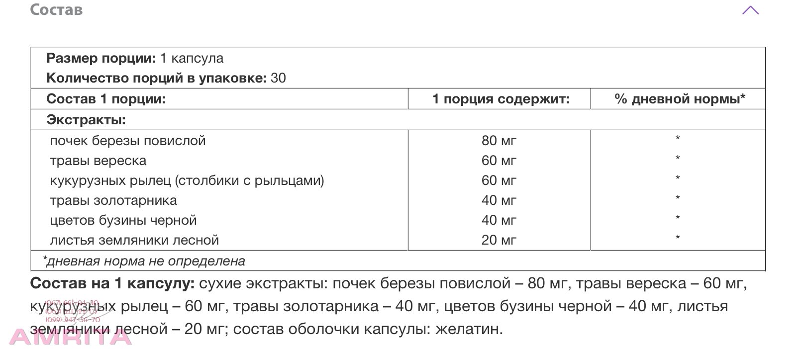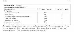 Состав на 1 капсулу: сухие экстракты: почек березы повислой – 80 мг, травы вереска – 60 мг, кукурузных рылец – 60 мг, травы золотарника – 40 мг, цветов бузины черной – 40 мг, листья земляники лесной – 20 мг; состав оболочки капсулы: желатин.