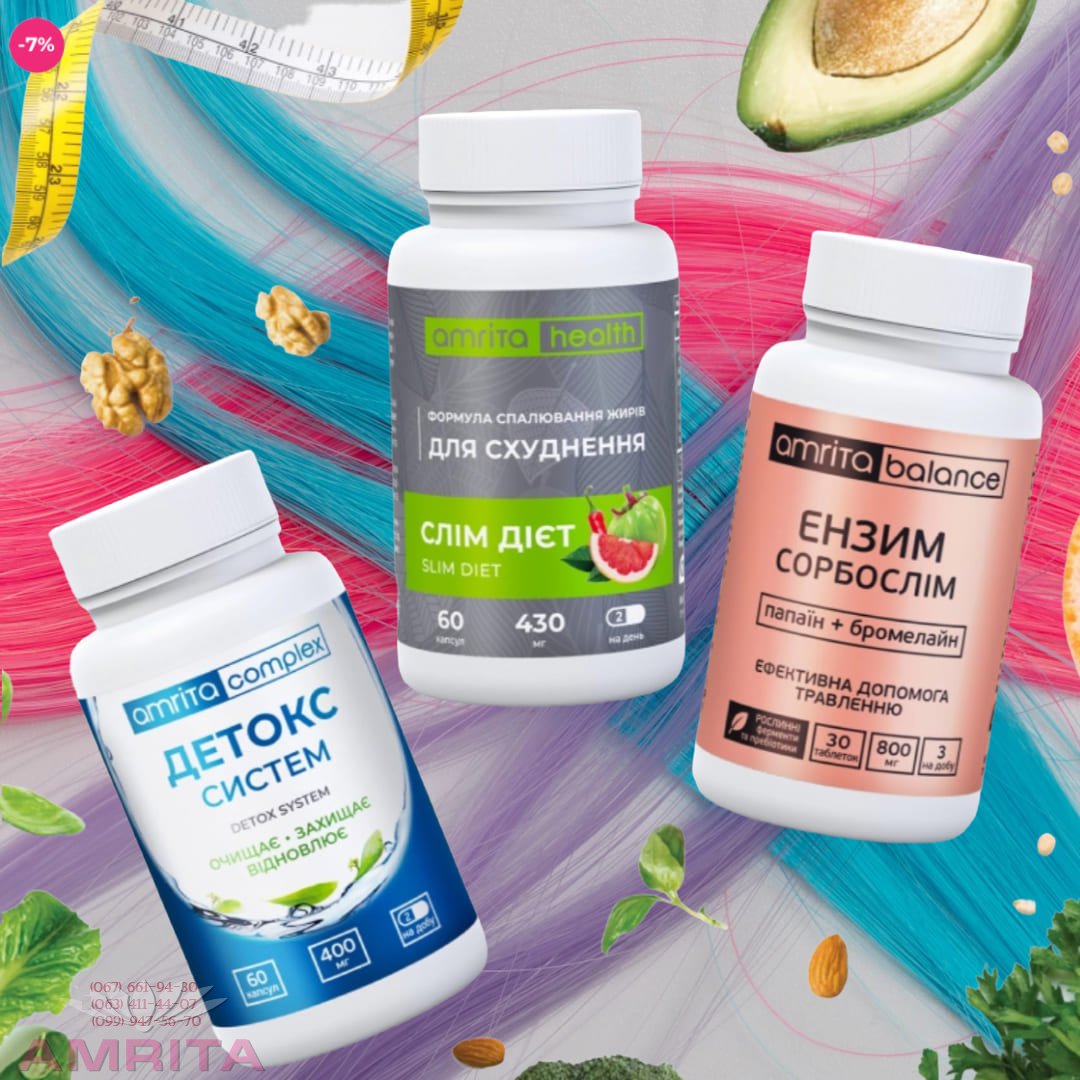 СЛИМ ДИЕТ + кайенский перец безопасная формула жиросжигателя для контроля массы тела и снижения избыточного веса. Способствует нормализации обменных и метаболических процессов в организме, уменьшению всасывания глюкозы и жиров в кишечнике. Помогает уменьшить чувство голода и стимулирует липолиз, расходует жировой запас, который был накоплен ранее. Улучшает естественные процессы детоксикации. Повышает работоспособность и выносливость.ЭНЗИМ СОБРОСЛИМ папаин + бромелайн синергетический комплекс природных ферментов, пищевых волокон и хитозана обеспечивает комплексную помощь пищеварению. Помогает переваривать жирную и белковую пищу, способствуя лучшему усвоению питательных веществ. Замедляет усвоение жиров и углеводов, связывает токсины в желудочно-кишечном тракте, способствует нормализации глюкозы в крови и выведению из организма продуктов распада. Улучшает перистальтику, способствует росту полезных бактерий в кишечнике.