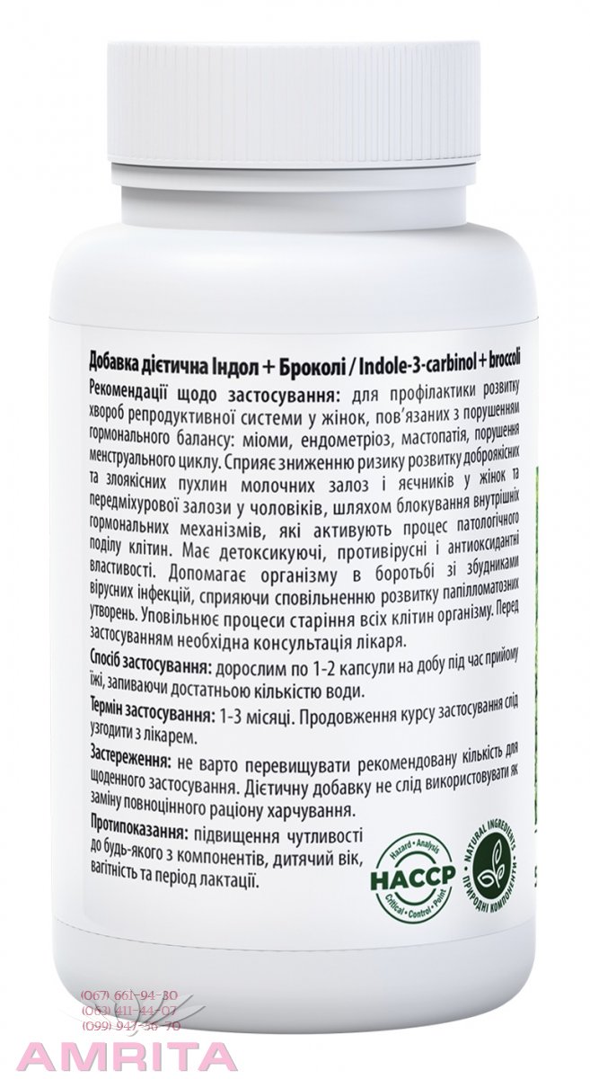 Amrita ІНДОЛ + БРОКОЛІ негормональний комплекс природних біологічно активних речовин для профілактики розвитку хвороб репродуктивної і статевої системи у чоловіків і жінок, пов’язаних з порушенням гормонального балансу (міоми, ендометріоз, мастопатія, порушення менструального циклу, захворювання простати тощо).