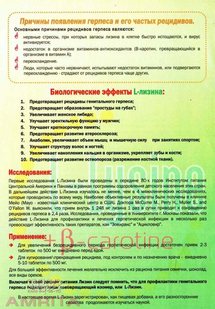 L-Лизин – профилактический биоактивный комплекс при рецидивирующих формах герпеса. Способствует удлинению межрецидивного периода при герпесе на губах и генитальном герпесе.