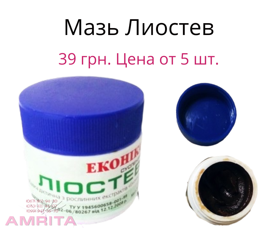 Мазь Лиостев, Амрита - мазь обладает противовоспалительными свойствами. Оказывает дезинфицирующее, противогрибковое, ранозаживляющее действия. Восстанавливает естественную эластичность кожи. Применяется в косметологии для обновления клеток кожи, разглаживания морщин и предотвращения появления новых.