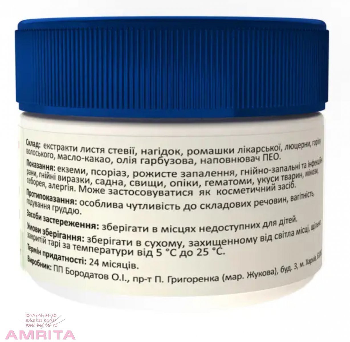 Мумифицированные экстракты стевии медовой, календулы, ромашки, люцерны, ореха, масло тыквы, масло какао.Не содержит: