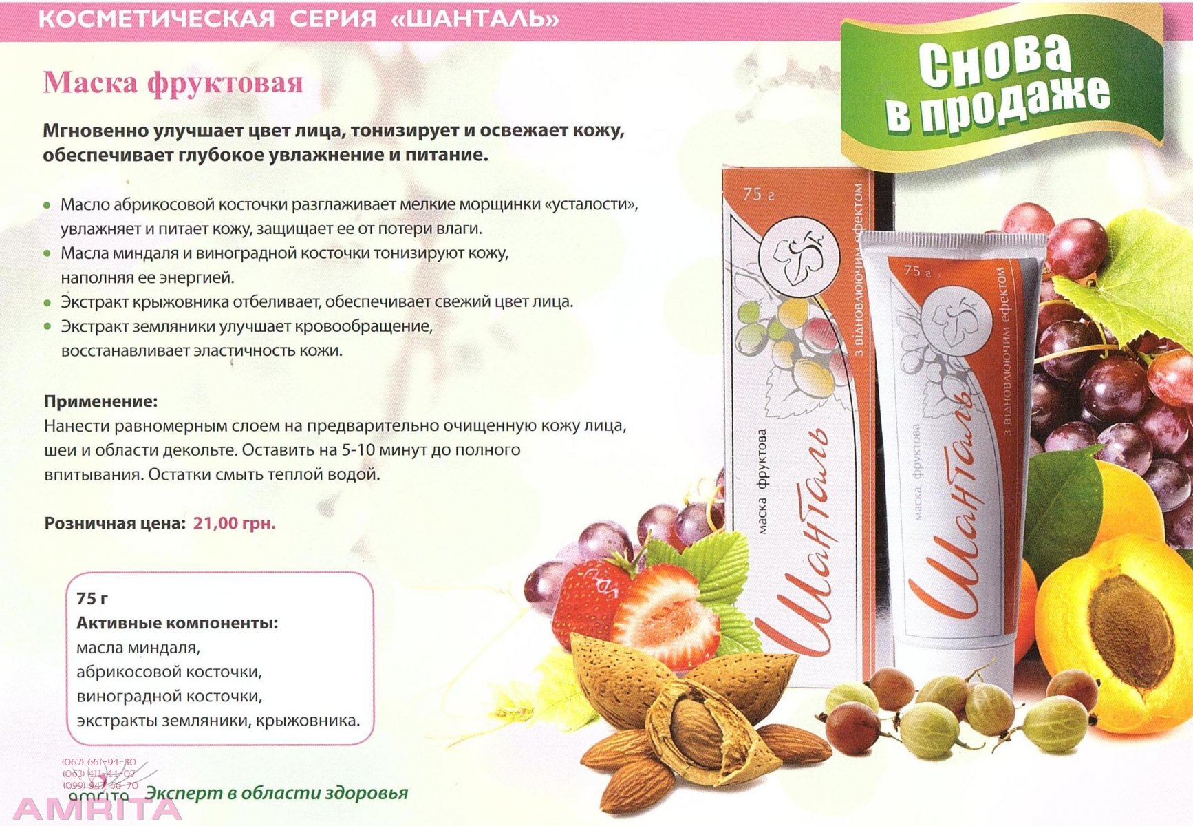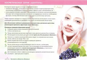 Преимущества: Увлажняет, питает и защищает кожу лица. Адаптирован для всех типов кожи.Основной компонент косметики «Шанталь» - масло виноградных косточек и экстракты плодов винограда. Высокая концентрация натуральных компонентов в составе всех продуктов.Активные компоненты: пчелиный воск, масло виноградных косточек, оливковое масло, масло облепихи, масло зародышей пшеницы,масло ши