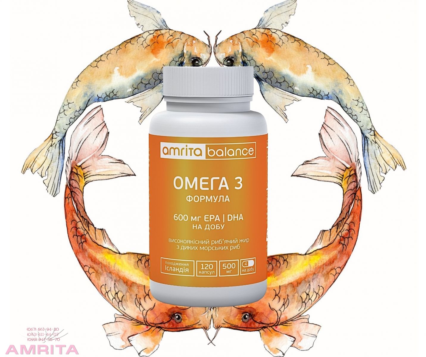 Применение продукта «Омега 3 формула» способствует уменьшению риска сердечно-сосудистых заболеваний: атеросклероз, ишемическая болезнь сердца, артериальная гипертензия, инсульт, инфаркт миокарда и др.Благодаря кооперации передовых ученных и лучших производителей, ГК Амрита, в 2021 году начинает поставки на рынки Украины и Европы, не имеющий аналогов продукт : Комплекс Омега-3. Состав на 1 порцию (3 капсулы): концентрированный рыбий жир – 1500 мг, Total Omega (общее количество Омега 3) – 864 мг, EPADHA (общее количество на порцию) – 728 мг, EPA эйкозапентаеновая кислота – 435 мг, DHA доксозагексаеновая кислота – 293 мг. Не содержит: лактозу, глютен, сою, ГМО, тяжелые металлы и свинец.