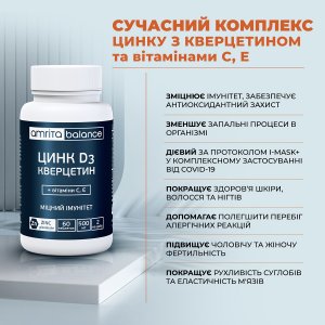 Рекомендации к употреблению: в качестве диетической добавки, как источник цинка, кверцетина, витаминов D3, С, Е для общего укрепления организма, укрепления иммунной системы и снижения риска осложнений респираторных вирусных инфекций. Способствует уменьшению склонности к аллергическим реакциям и аутоиммунных нарушений, нормализации функционирования эндокринной, мужской и женской половой систем. Помогает синтезировать белок коллаген, который обеспечивает упругость кожи, положительно влияет на состояние суставов и связок.Способ применения: взрослым принимать по 2 табл. в день во время еды. Рекомендуемый курс приема 1-3 месяца.Противопоказания: детский возраст, беременные и женщины в период лактации (кроме случаев, когда применение продукта рекомендовано лечащим врачом), индивидуальная непереносимость компонентов продукта.Предостережение по применению: не следует превышать рекомендуемое количество для ежедневного потребления. Не следует использовать в качестве замены полноценному питанию. Перед применением рекомендована консультация врача. Не является лекарственным средством.