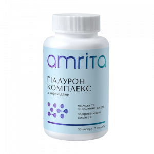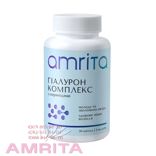 - Гіалурон комплекс з керамідами від Amrita - унікальний косметичний нутрицевтик, що починає красу зсередини! Містить високоякісні складові: гіалуронову кислоту, коензим Q10, природний вітамін С, біофлавоноїди та запатентовані фітокераміди CERAMOSIDES™ виробництва Франції, що мають клінічно підтверджену ефективність. Експертний комплекс допомагає підвищити рівень власного колагену, наповнює шкіру необхідними мікронутрієнтами, забезпечує зволоження та пружність шкіри та уповільнює вікові зміни. Живить волосся зсередини, зміцнюючи волосяні фолікули, сприяє росту волосся, покращує його еластичність, пружність, блиск та об’єм. Ефективний в програмах здоров'я шкіри, волосся, зв'язок та суглобів.