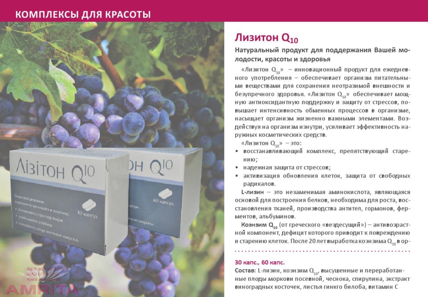 Це косметичний нутрицевтик від Amrita, який підтримує шкіру й волосся на рівні мікронутрієнтів. У формулі — гіалуронова кислота, коензим Q10, природний вітамін C з біофлавоноїдами та запатентовані фітокераміди CERAMOSIDES™ (Франція), ефективність активів яких підтверджена клінічними дослідженнями.