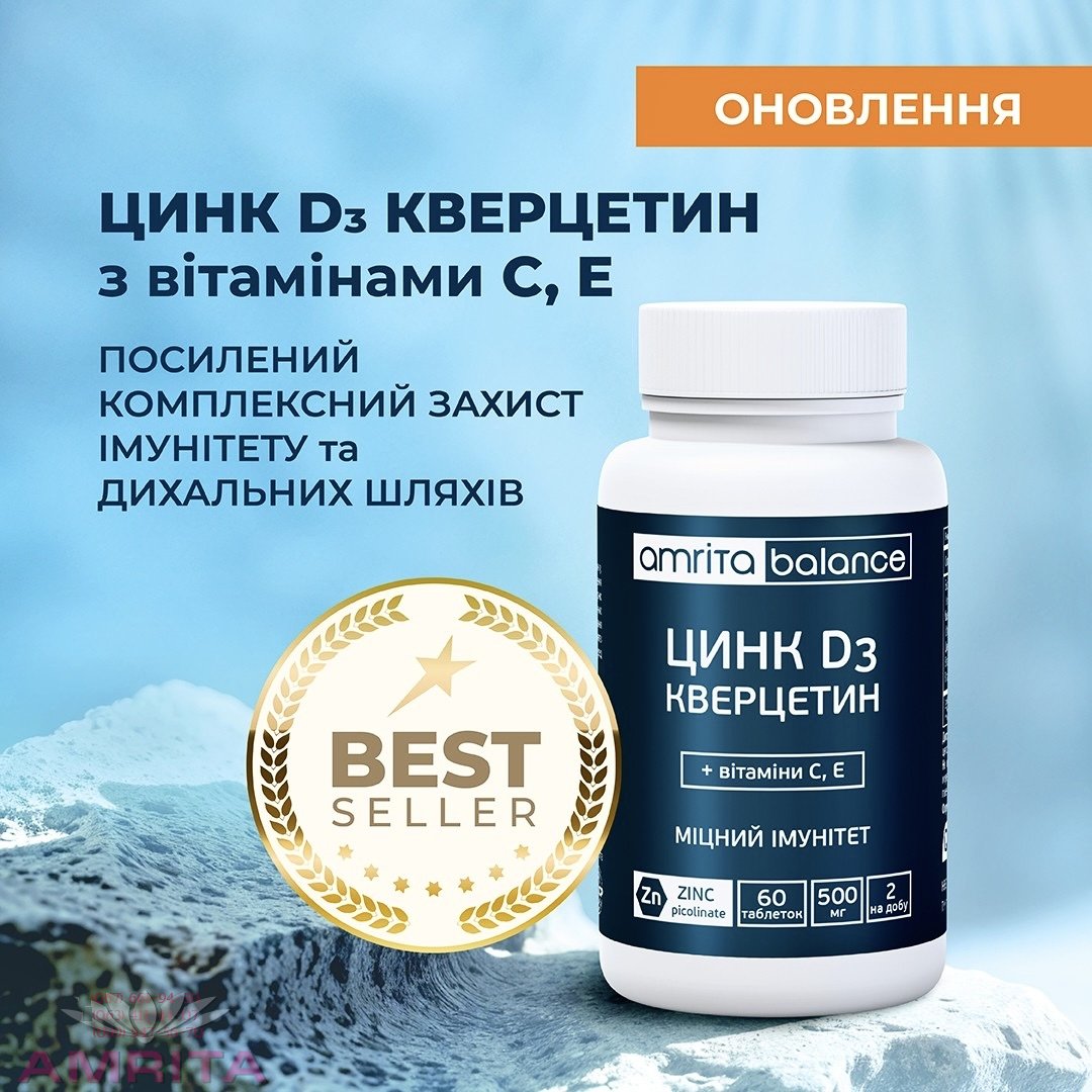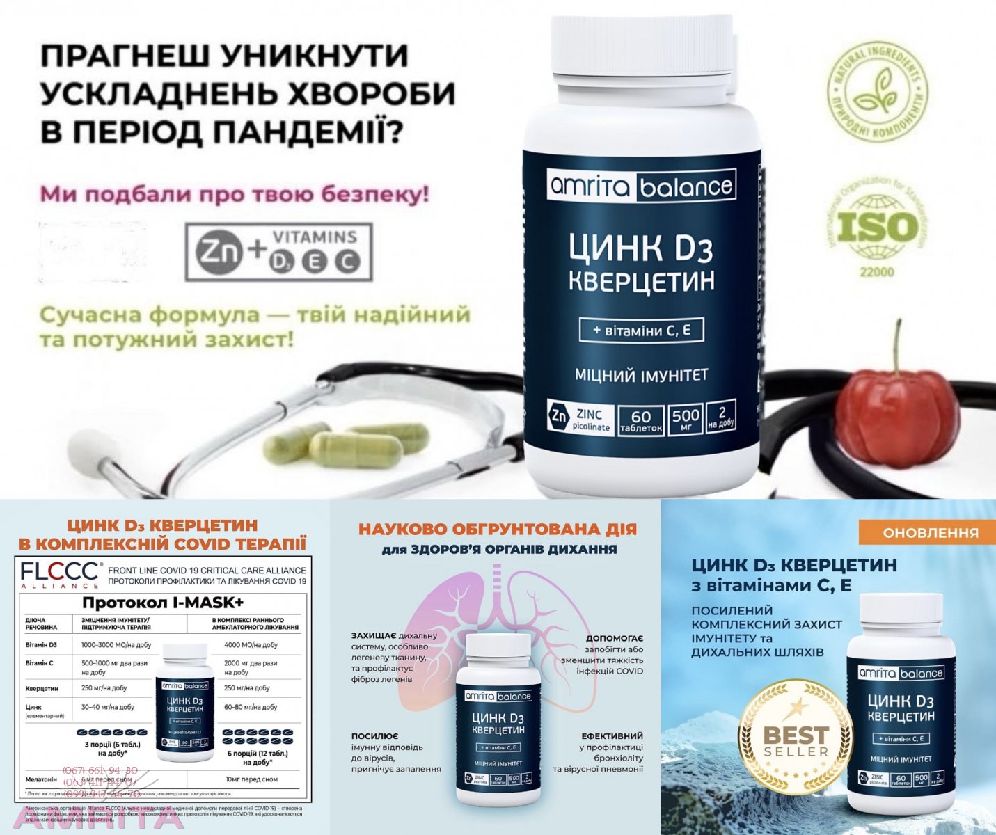 • Інноваційний комплекс цинк піколінат з вітамінами С, D3, Е та кверцетином для профілактики пневмонії та для здоров'я шкіри, волосся та нігтів у таблетках 500 мг.