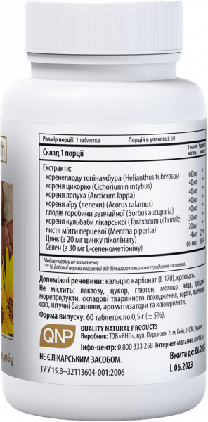 ✅Состав 1 таблетки: экстракты корнеплода топинамбура – 60 мг, корня цикория – 40 мг, корня лопуха – 40 мг, корня аира – 40 мг, плодов рябины обыкновенной – 40 мг, корня одуванчика – 30 мг, листьев мяты перечной – 20 мг, цинка пиколинат – 20 мг (соответствует 4 мг иона цинка), селенометионин – 10 мг (из неактивных дрожжей GoldCell, соответствует 25 мкг иона селена). Вспомогательные вещества: кальция карбонат (Е 170), крахмал.