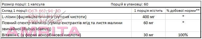 ЛИЗИН АКТИВ БАЛАНС + малина мощный комплекс незаменимой аминокислоты L-лизин (фармацевтического качества) с натуральными витаминами и ценными растительными экстрактами для борьбы с сезонными, вирусными и инфекционными заболеваниями, в т.ч. с вирусом простого герпеса. Помогает снизить проявления вируса герпеса, угнетая его способность проникать в клетки и размножаться.