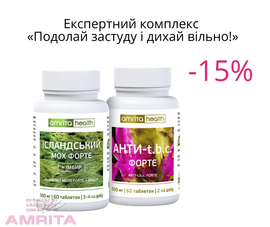 - Експертний комплекс «Подолай застуду і дихай вільно!»Знижує ймовірність і тяжкість ускладнень хвороби, усуває довгострокові симптоми гострих респіраторних захворювань та сезонних застуд (затяжний кашель та нежить, подразнення горла). Підвищує опірність організму та запобігає захворюванням дихальної системи!