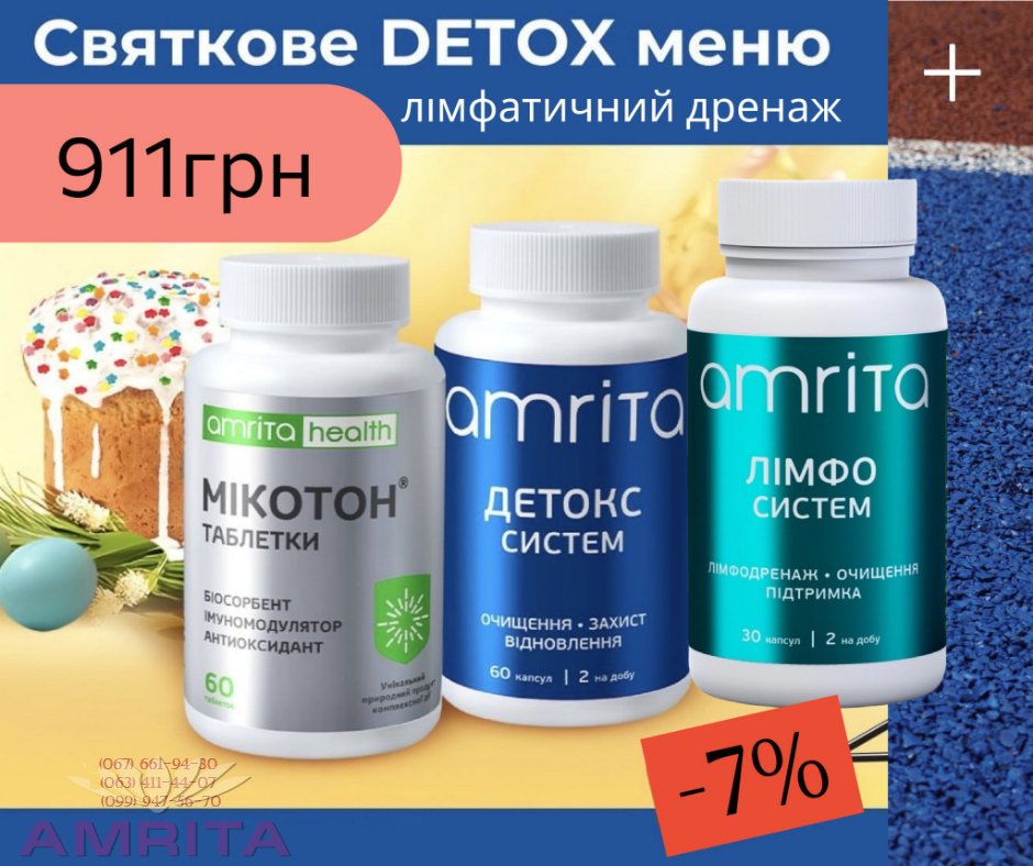 МІКОТОН — природний сорбент і антисептик. Виводить токсини, очищує кишківник, підтримує мікрофлору.- ДЕТОКС СИСТЕМ — глибоке очищення печінки й крові. Захист від токсичного навантаження.