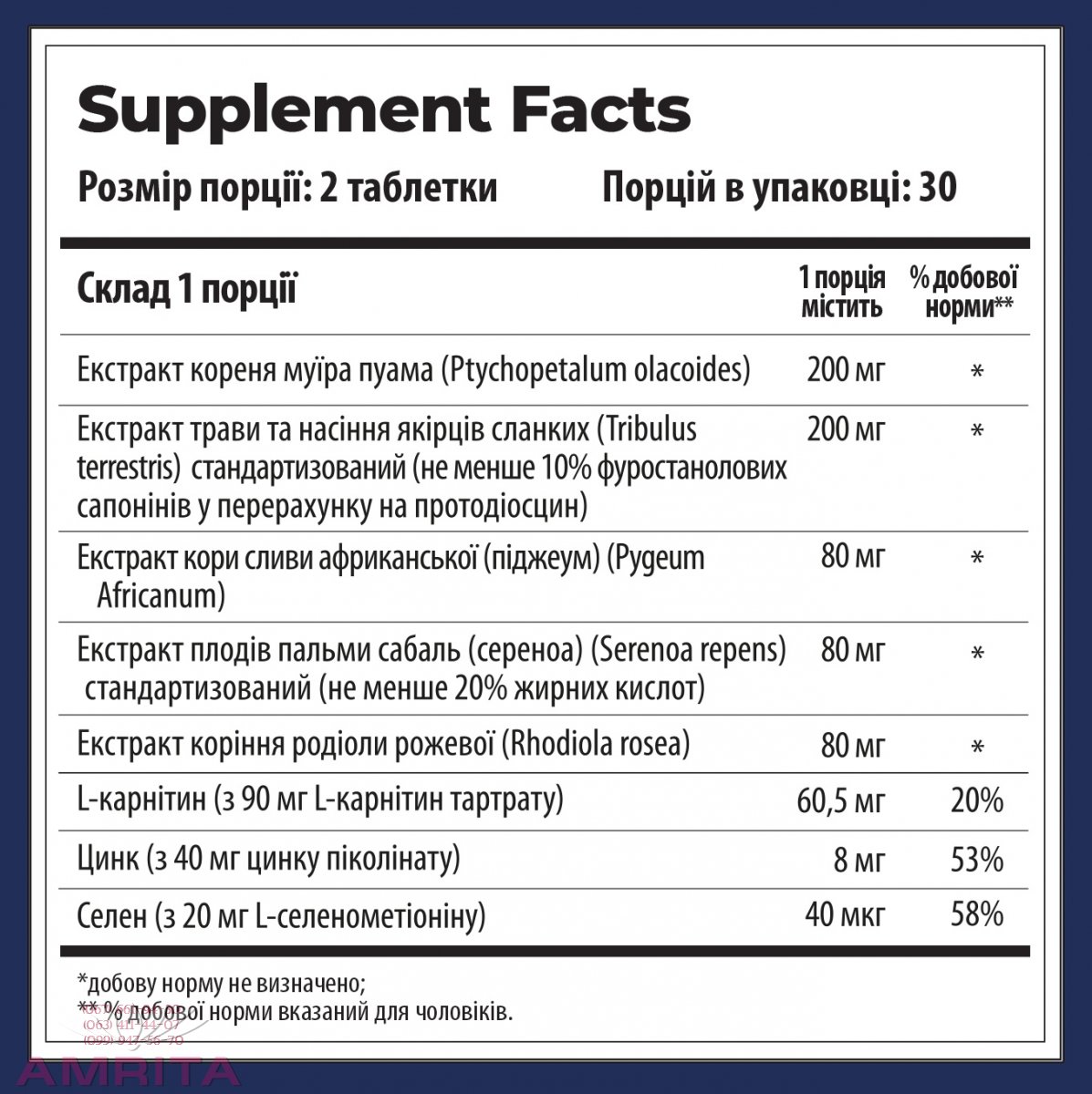 Компонент Кількість у порції % добової норми* Екстракт кореня муїра пуама 200 мг * Екстракт стандартизований трави та насіння якірців сланких 200 мг * Екстракт кори сливи африканської (піджеум) 80 мг * Екстракт плодів пальми сереноа 80 мг * Екстракт кореня родіоли рожевої 80 мг * L-карнітин 60,5 мг 20% Цинк (пікалінат) 8 мг 53% Селен (L-селенометіонін) 40 мкг 58% *Добова норма не визначена для деяких компонентів