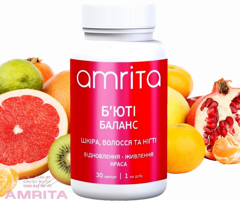 Б’юті Баланс – це збалансований комплекс натуральних компонентів, створений для підтримки здоров’я та краси шкіри, волосся і нігтів. Унікальна формула містить рослинні екстракти, вітаміни, мінерали та амінокислоти, що сприяють відновленню, живленню та захисту від негативного впливу навколишнього середовища.