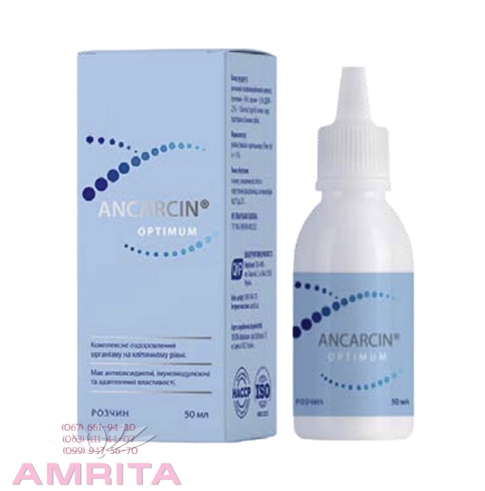 Скачайте листовку и используйте в своей работе.Анкарцин® раствор Optimum, 50 мл. ( 550 капель)«Анкарцин» обладает антиоксидантными, иммуномодулирующими и адаптогенными свойствами.Состав: растворимый полифенолкарбоновый комплекс (ПФК), выделенный из микроорганизма Nadsoniella nigra х-1 (черные антарктические дрожжи) – 0,125 мг/мл (эумеланин – 95%, тирозина – 2,5%, ДОФА (диоксифенилаланин) – 2,5%), вода подготовленная (с ионами серебра).Анкарцин® в капсулах на протяжении последних 12-ти лет проявляет себя как уникальный продукт комплексного действия, аналогов которому нет, не только в Украине, но и за рубежом. Будучи разработанным нашими учеными и пройдя ряд клинически к исследований, Анкарцин в капсулах помог белее чем 50 тысячам людей в профилактике и комплексной терапии различных состояний связанных с нарушением здоровья. На протяжении всего периода существования продукта, признание получено не только в благодарных отзывах потребителей, в виде наград и премий.АНКАРЦИН- Революционный продукт от украинских ученыхКомплексное оздоровление Вашего организма на клеточном уровне.