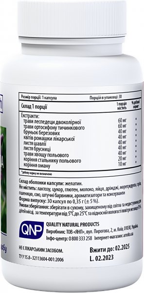 Компонент Кількість (мг) Екстракт леспедеци двоколірної 60 Екстракт ортосифону тичинкового 60 Екстракт бруньок берези 60 Екстракт квітів ромашки 40 Екстракт листя шавлії 40 Екстракт листя брусниці 40 Екстракт трави хвоща польового 40 Екстракт коренів стальника польового 20 Екстракт коренів оману (дев’ясилу) 10 Фітокомплекс для нирок та сечовидільної системи