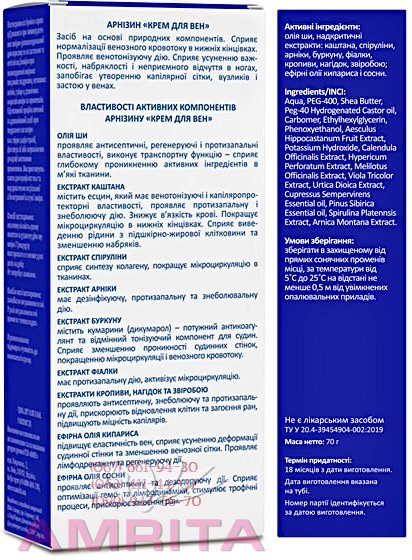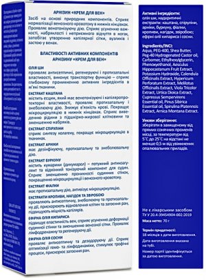 - «Арнізин крем для вен» — натуральний засіб для місцевого застосування. Покращує мікроциркуляцію, стимулює синтез колагену та підтримує еластичність венозних стінок.