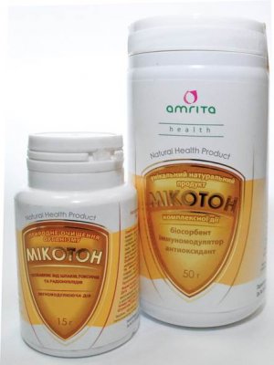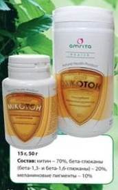 МИКОТОН - инновационная разработка, биологически активная добавка на основе натуральных грибных биополимеров: хитина, глюканов и меланинов (ТУУ 15.8-23710945.004-2002).