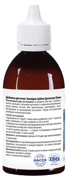 Также является прекрасным антисептиком: применяется как обеззараживающее и ранозаживляющее средство при различных ранах, порезах, ссадинах и инфекциях кожи. Уникальные характеристики Аргентум плюс - отсутствие привыкания микроорганизмов к нему и безопасность применения — делают этот продукт незаменимым в комплексных программах лечения различных воспалительных процессов в организме.
