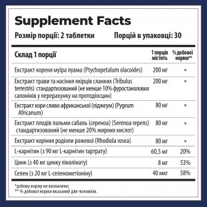 Состав на одну порцию (2 капсулы): экстракты сухие: корни муира пуама – 200 мг, травы якорцов стелющихся – 200 мг, L-карнитин – 60,5 мг, сливы африканской (пиджеум) – 80 мг, ягод пальмы сереноа (со пальметто) – 80 мг, родиолы розовой – 80 мг; цинка пиколинат – 40 мг (соответствует 8 мг иона цинка); L-селенметионин (соответствует 40 мкг иона селена)