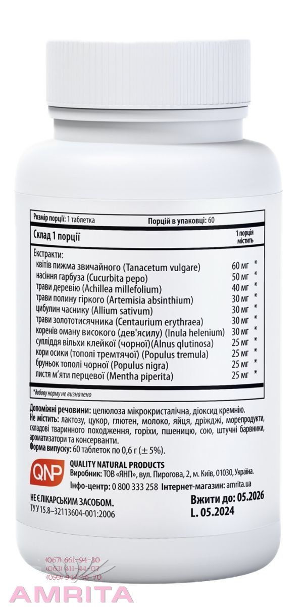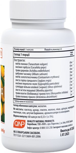 По 1 капсуле 2-3 раза в сутки.Состав активных ингредиентов на 1 капсулу: экстракты: пижмы – 60 мг (mg), семена тыквы – 60 мг (mg), тысячелистника – 40 (mg), золототысячника – 30 мг (mg), листа ореха – 30 мг (mg), семена переката-поле (телоксис) – 25 мг (mg), соплодие ольхи черной – 25 (mg), листья мяты перечной – 20 (mg), вахты (трифоль) – 5 мг (mg), травы полыни горькой – 5 мг (mg). Состав оболочки капсулы: желатин.