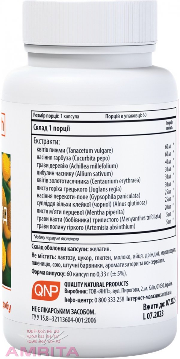 По 1 капсуле 2-3 раза в сутки.Состав активных ингредиентов на 1 капсулу: экстракты: пижмы – 60 мг (mg), семена тыквы – 60 мг (mg), тысячелистника – 40 (mg), золототысячника – 30 мг (mg), листа ореха – 30 мг (mg), семена переката-поле (телоксис) – 25 мг (mg), соплодие ольхи черной – 25 (mg), листья мяты перечной – 20 (mg), вахты (трифоль) – 5 мг (mg), травы полыни горькой – 5 мг (mg). Состав оболочки капсулы: желатин.