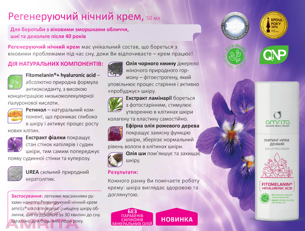 ✅Превосходит все зарубежные аналоги по безопасности, эффективности и способности приостанавливать процессы старения. Производится в Украине. Крем Амрита Лифтинг 40+ , инновационное средство для молодости кожи. Новое поколение ухаживающих продуктов с высокомолекулярной, современной формулой гиалуроновой кислоты и фитомеланина полученного из берёзового гриба Чага, благодаря которой кожа способна впитать большее количество влаги, лучше ее сохранить и наполниться живительной силой и энергией.