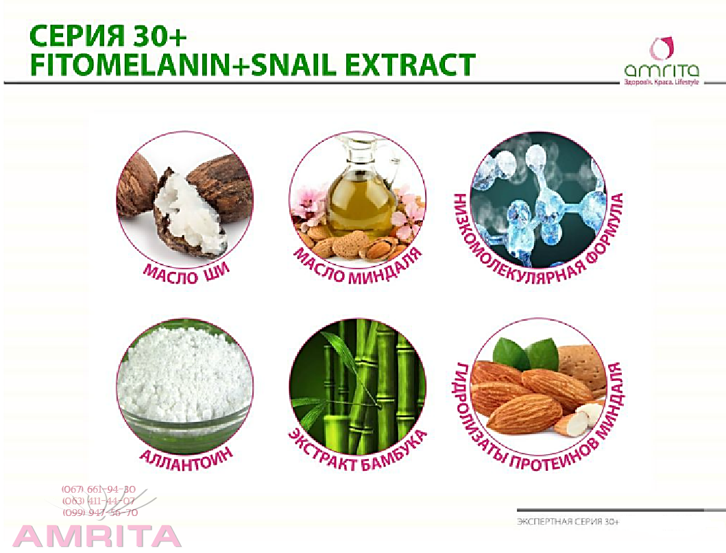 “Beauty “-лаборатория компании “Амрита” совместила в данной уникальной формуле таких два эффективных компонента, как фитомеланин - который является естественным проводником активных косметических компонентов в глубокие слои эпидермиса с таким ценнейшим компонентом как экстракт муцина улитки.