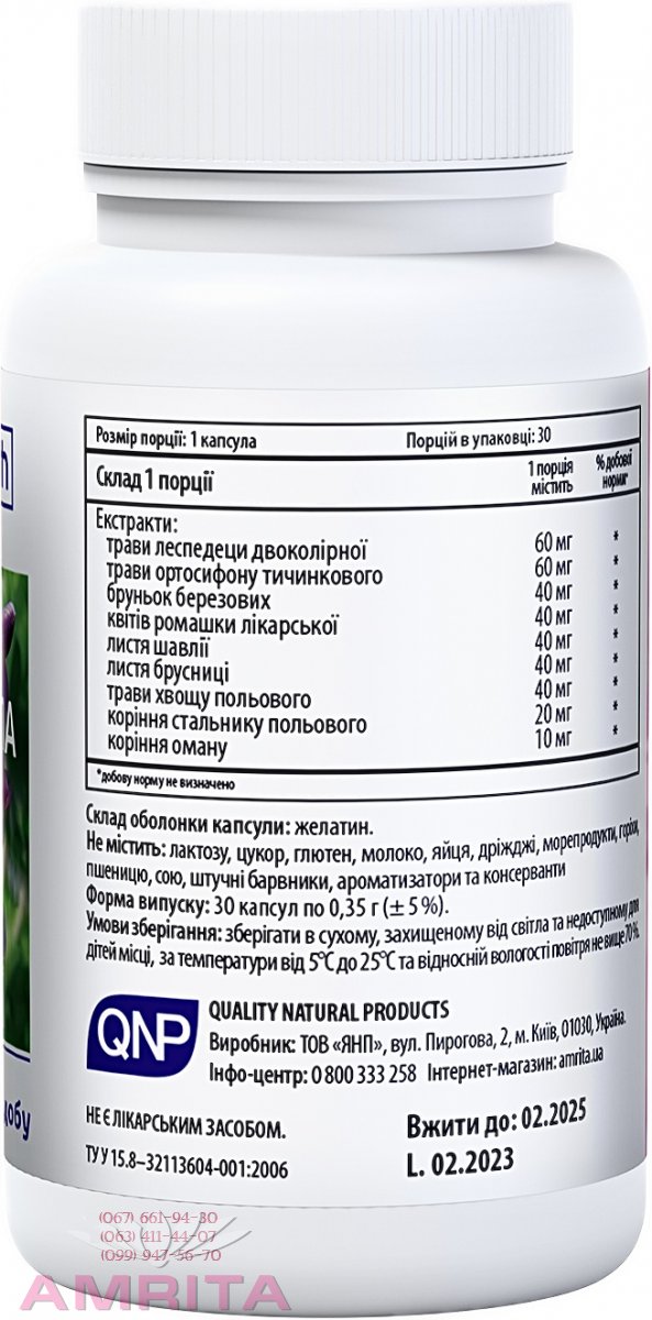 Состав на 1 капсулу: экстракт леспедецы двухцветной – 60 мг (mg), экстракт ортосифона тычиночного – 60 мг (mg), экстракт березовых почек – 60 мг (mg), экстракт цветов ромашки – 40 мг (mg), экстракт листа шалфея – 40 мг (mg), экстракт листа брусники – 40 мг (mg), экстракт травы хвоща полевого – 40 мг (mg), экстракт корней стальника полевого – 20 мг (mg), экстракт корней девясила – 10 мг (mg).