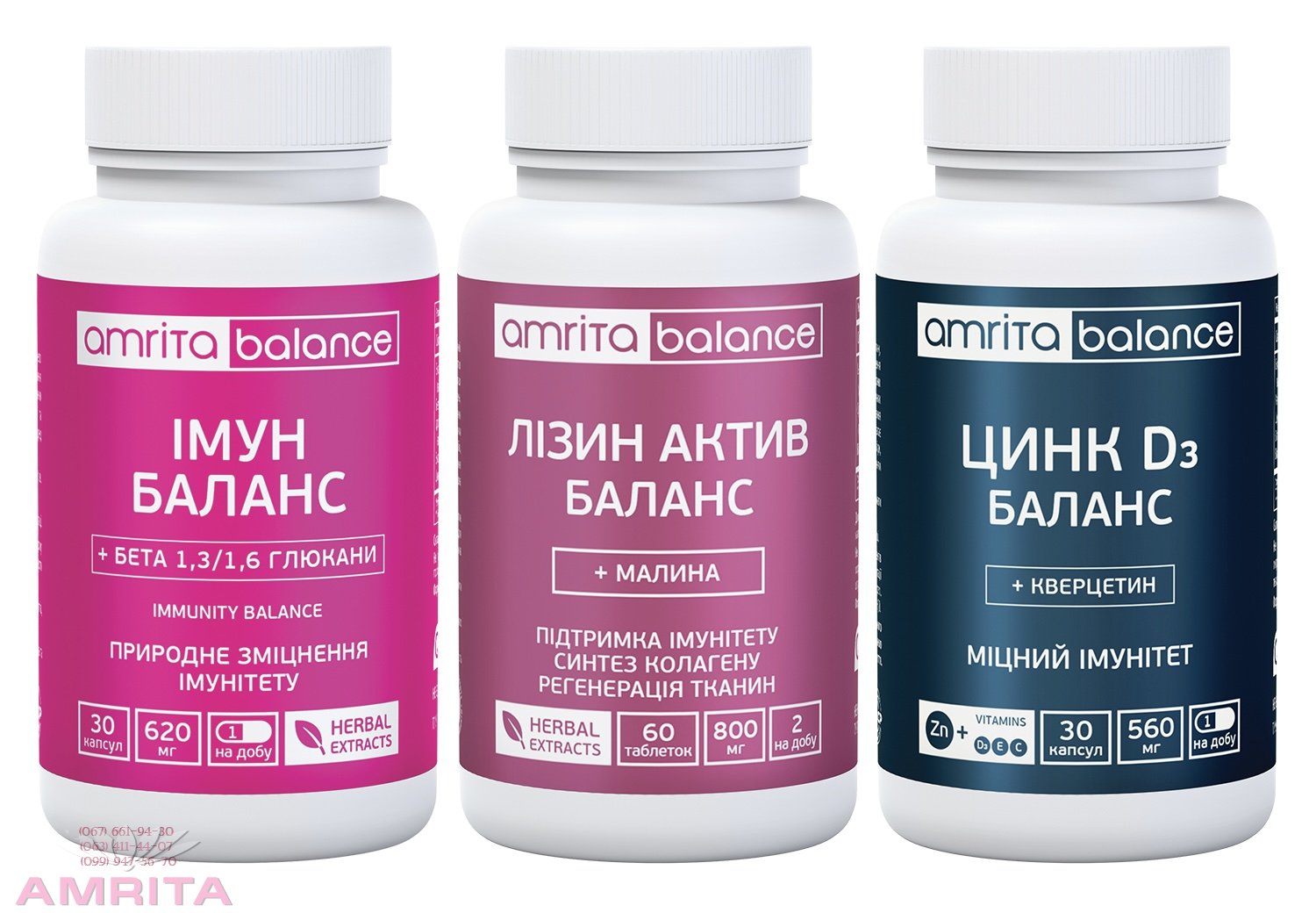 Базовый состав комплекса: «Мульти Баланс + янтарная кислота», «Цинк D3 баланс + кверцетин», «Лизин Актив баланс + малина»